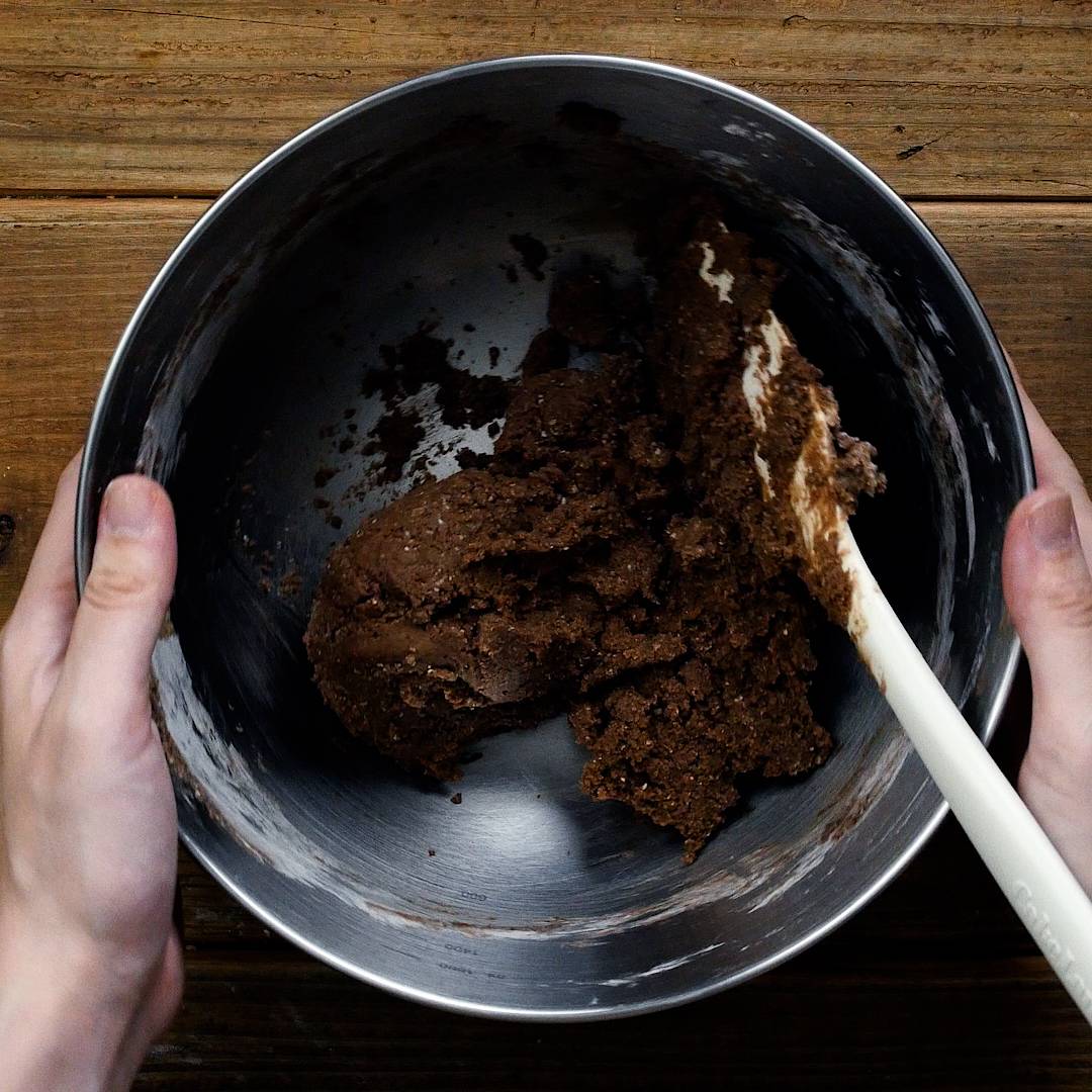 合わせておいた粉類を加え、ゴムベラで切るように混ぜ合わせ、生地をまとめます。