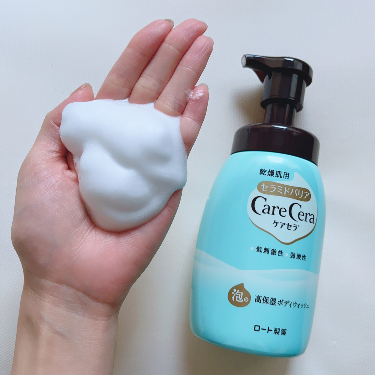 『ケアセラ』のこのモコモコ泡って、お肌の上で酸化しやすい不要な油分を取り除き、お肌に必要な油分は残すという技術が採用されたらしく、これまでのボディソープにありがちな落としすぎがないそうなんです。