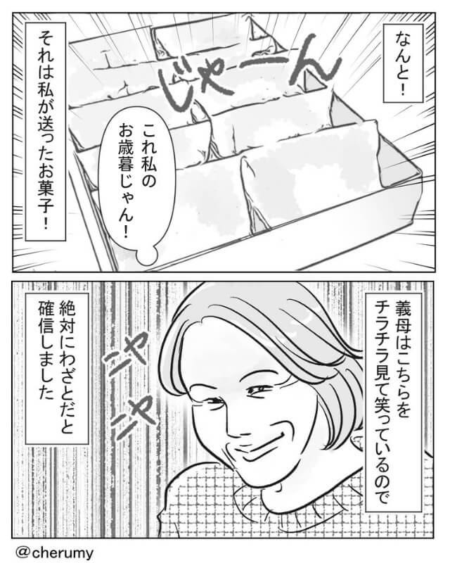 義両親へのお中元やお歳暮は毎年の恒例行事なので、悩んで選ぶことが多いです。 その努力を嫌がらせに使われると思うと心が痛くなってしまいました。 (30代/女性)義両親に喜んでもらえるようにと一生懸命選んだものをこのような形で出されたらショックですね…。 主人公が義母と縁を切りたくなる気持ちもわかる気がします。 (30代/女性)イラスト:cherumy