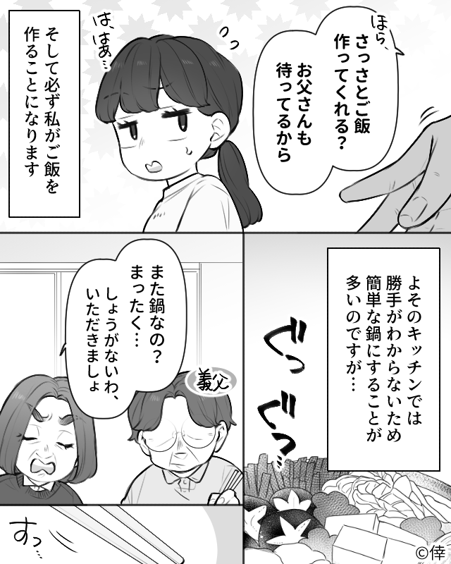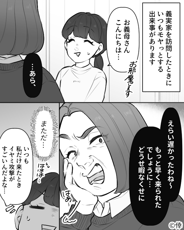 義実家へ行くと、嫁いびりをされてしまう主人公。