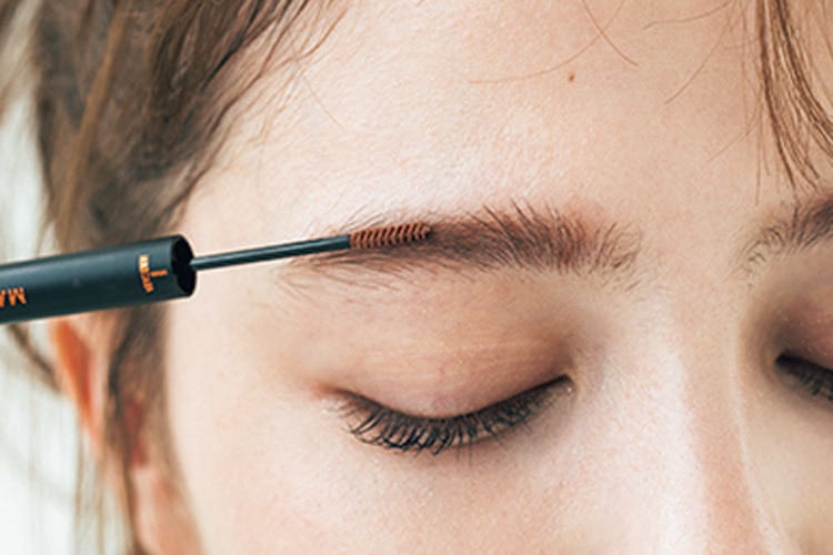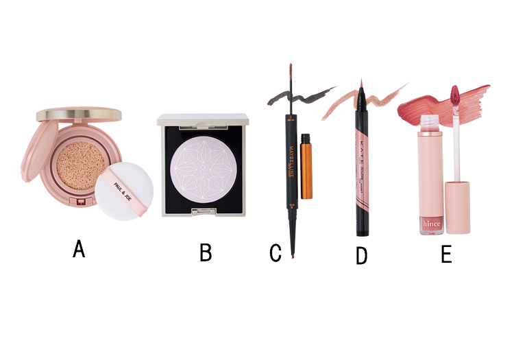 Cのペンシル側で眉を描き、反対のマスカラ側で色づけ。目尻ラインと下まぶたのインサイドラインをDで引き、うぶな目元を演出。眉を明るくすると、薄メイクでもあか抜ける。