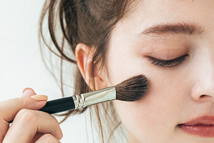 Bをブラシにとり、全顔にふわっとのせる。ラベンダーカラーとほのかなラメで透明感を引き上げると同時に、フィルターがかかったようなほわほわ肌に仕上がる。