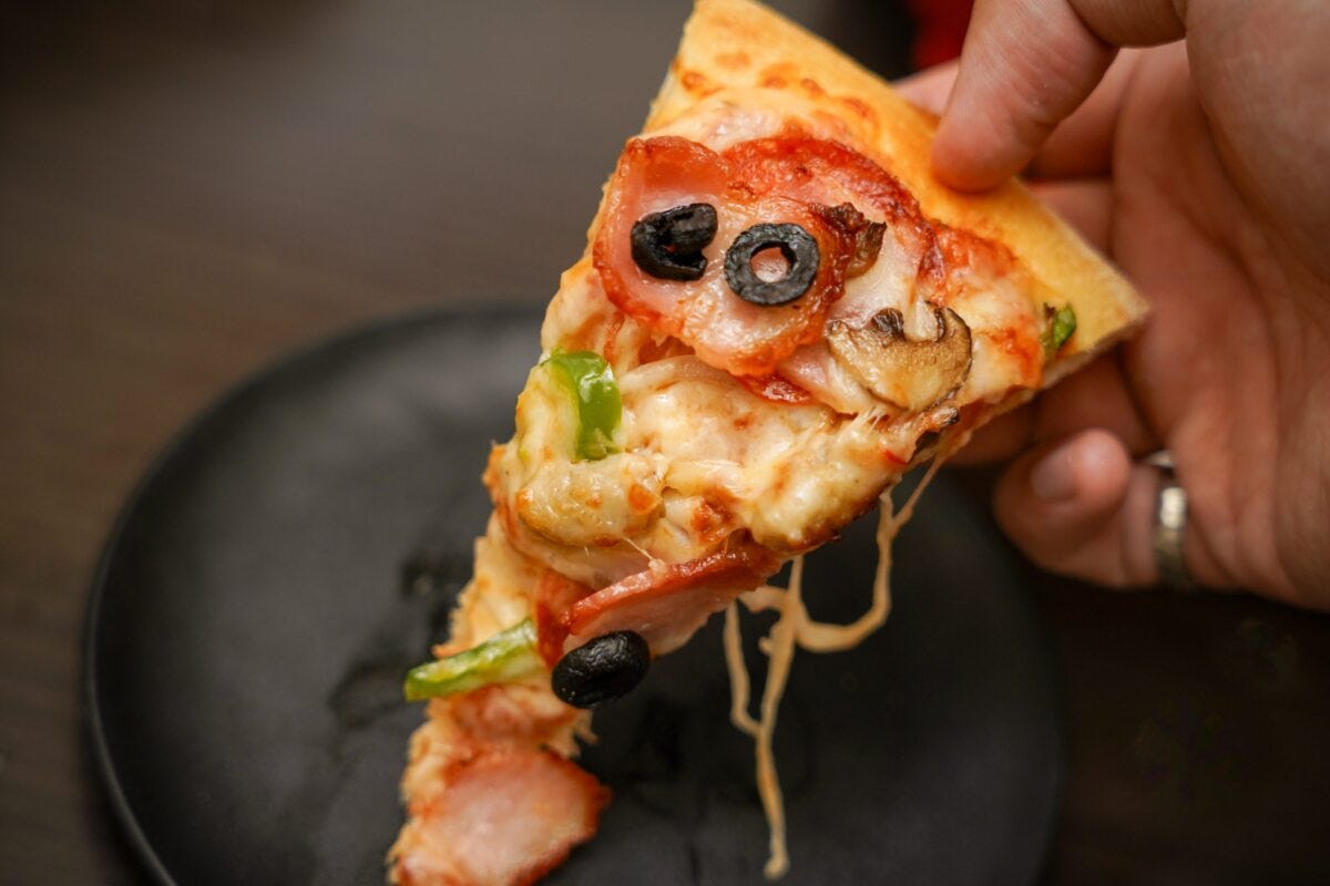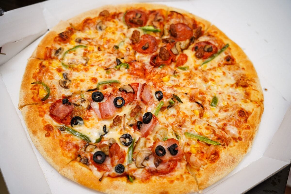ペパロニやハム、ベーコン、イタリアンソーセージなど肉系の具材がたっぷりとトッピングされており、さらにはブラックオリーブがアクセントになっている。エキストラチーズも乗っているためチーズの濃厚な味わいも楽しめて、真っ直ぐな贅沢感があるように感じた。