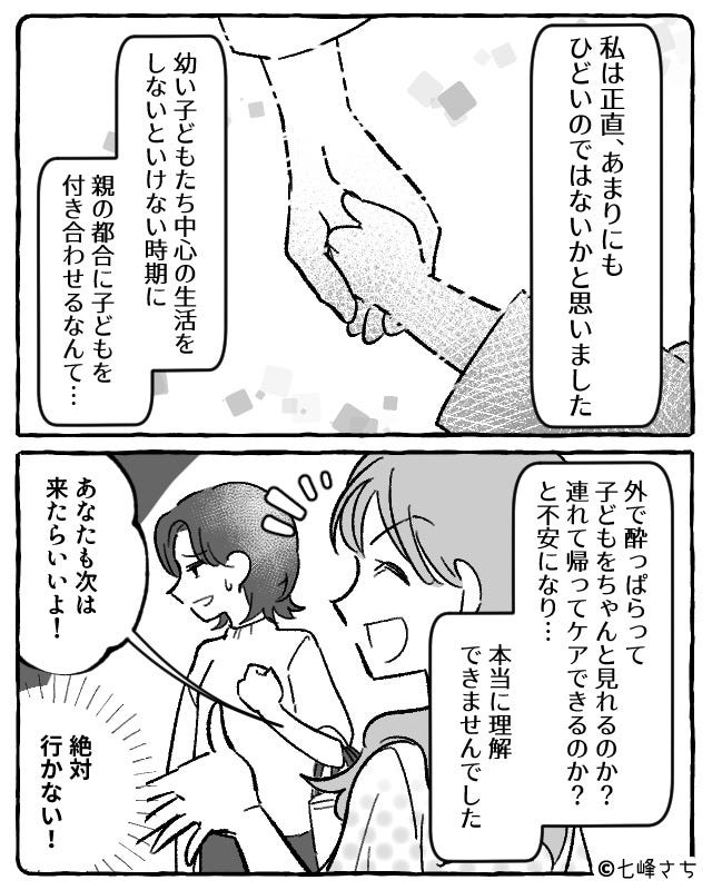 幼い子どもを連れて、お酒を楽しんでいたママ友たち。