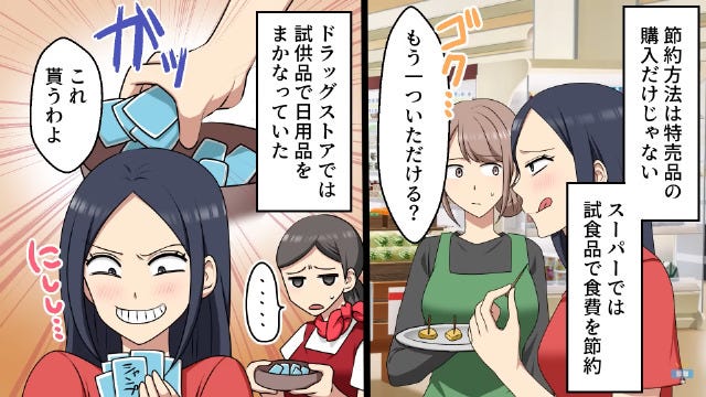スーパーの試食や、試供品をたくさんもらうことで節約をしていた主人公。