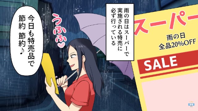 主人公の住む町では、雨の日に特売を実施するスーパーがありました。