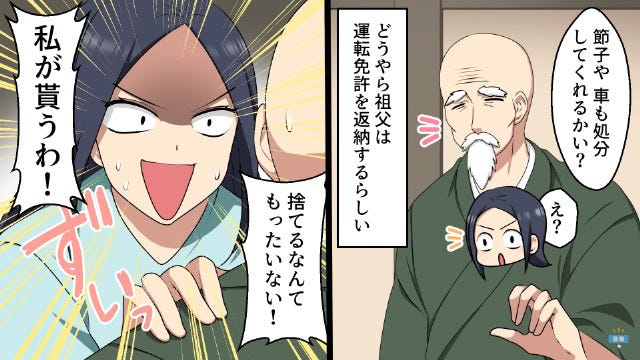 車を捨てるのはもったいないと思った主人公は、祖父の車を譲り受けることに。