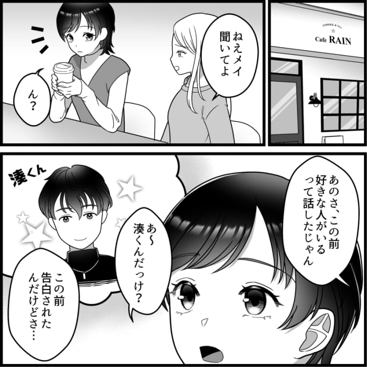 主人公のメイは、友だちのエマとカフェで話をしています。