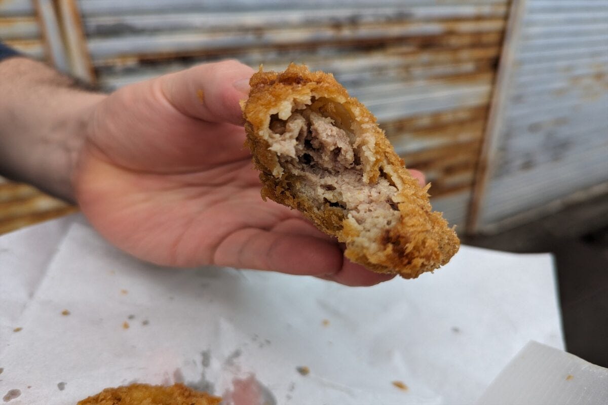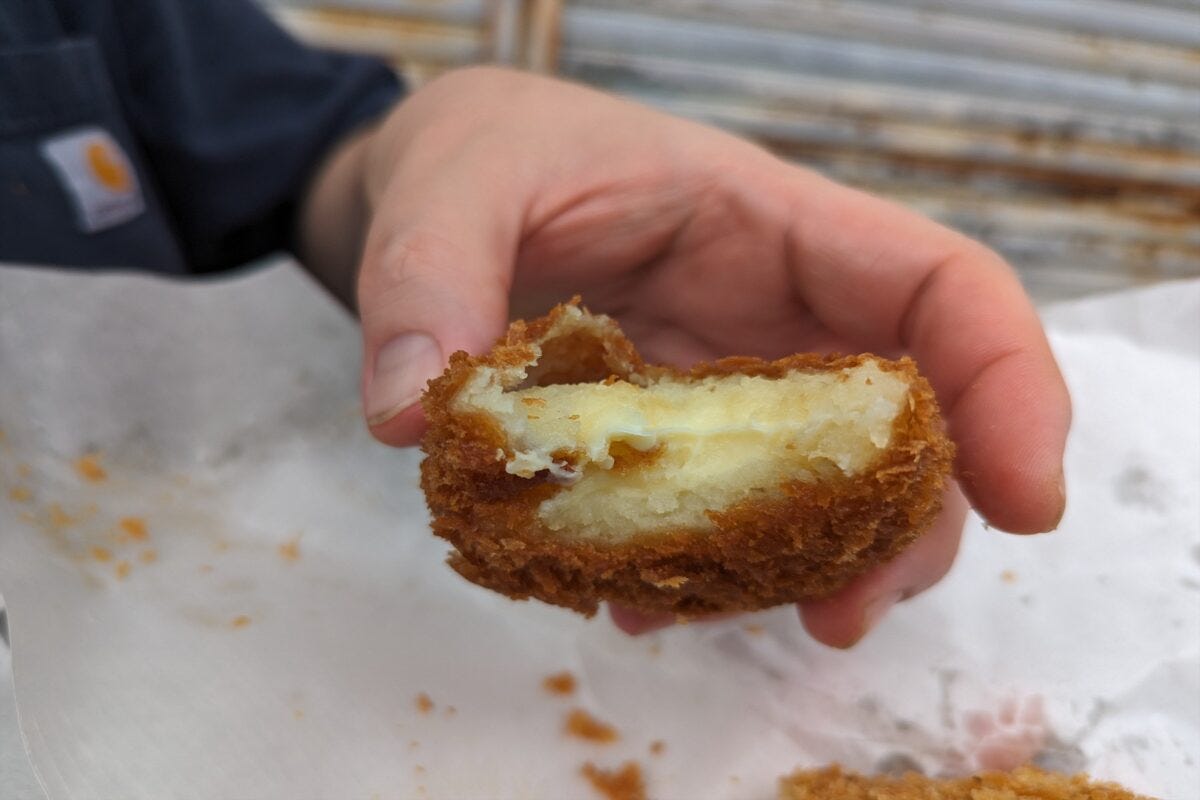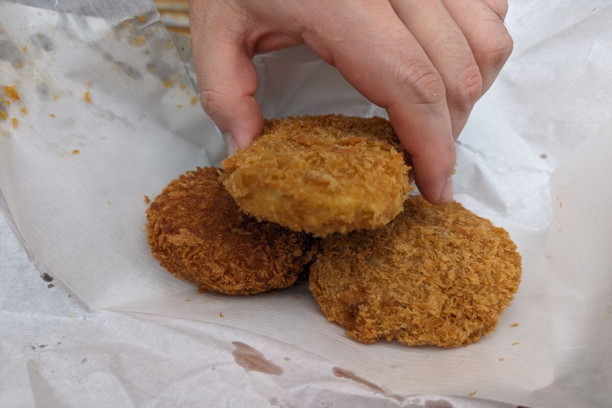 戸沢精肉店では、定番のメンチカツやコロッケ以外にもカニクリームコロッケやうずらフライなど、美味しそうな揚げ物がたくさん。今回は定番2種のほかに、チーズフォンデュコロッケを購入した。