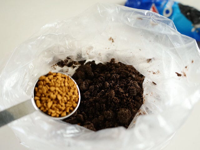 ① ビニール袋にオレオクッキーを入れ、麺棒を使って細かく砕く。またはコップの底などを利用して砕く。