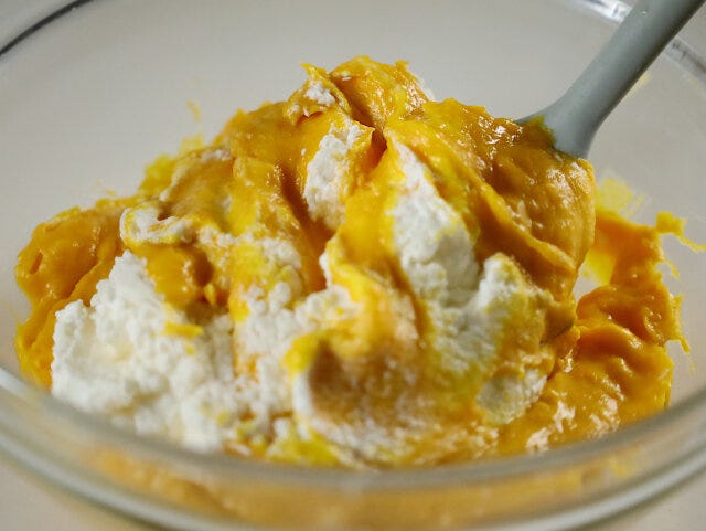 ⑥ マスカルポーネチーズを入れたら、フォークをゴムベラに持ち替えて混ぜる。
