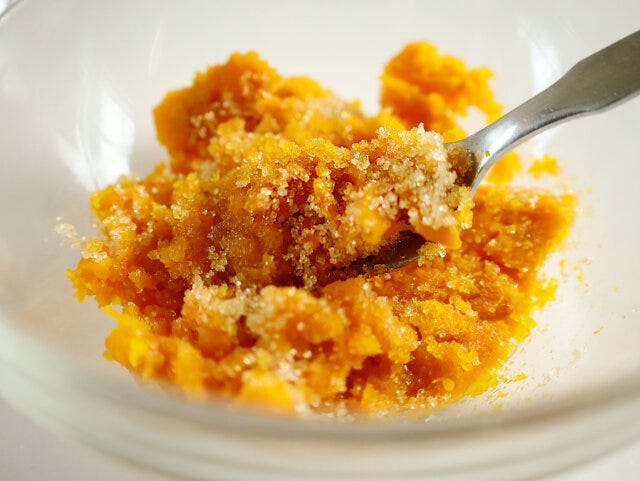 ④ 取り出したら、フォークを使って潰し、ペースト状にする。