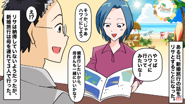 新婚旅行に母を連れていった主人公。