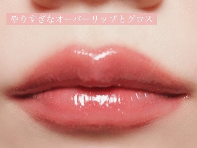 素の唇の色に近いリップライナーでリップラインをオーバーに描き、リップもグロスもベタ塗りした唇は写真映りがいいのでSNS映えしやすいのですが、実際に見るとかなり不自然で、やりすぎな印象に見えてしまいます。
