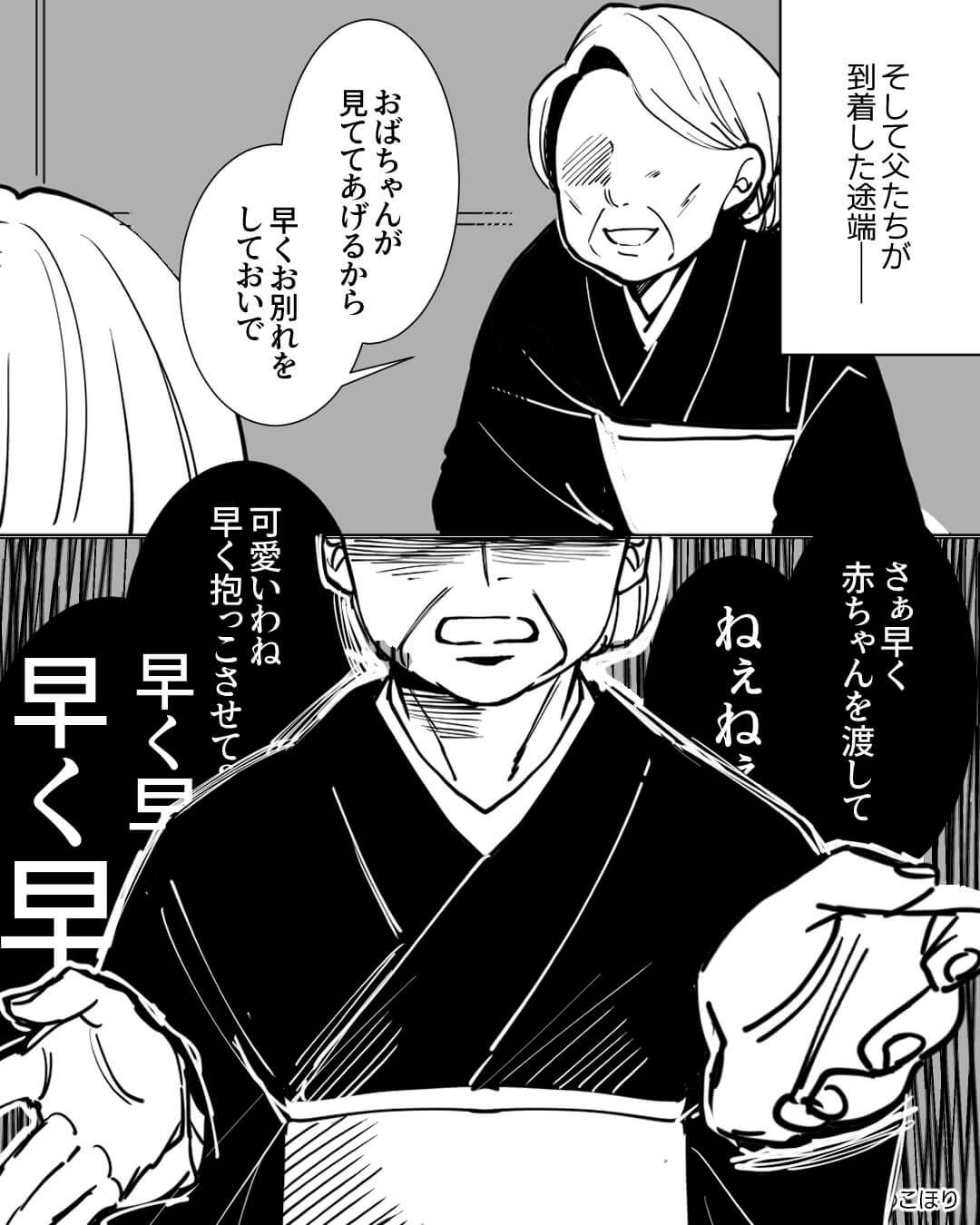 棒読みで「さあ早く…早く早く早くその子を渡して」とまるで子どもを奪おうとしているかのような発言をするおばあさん。
