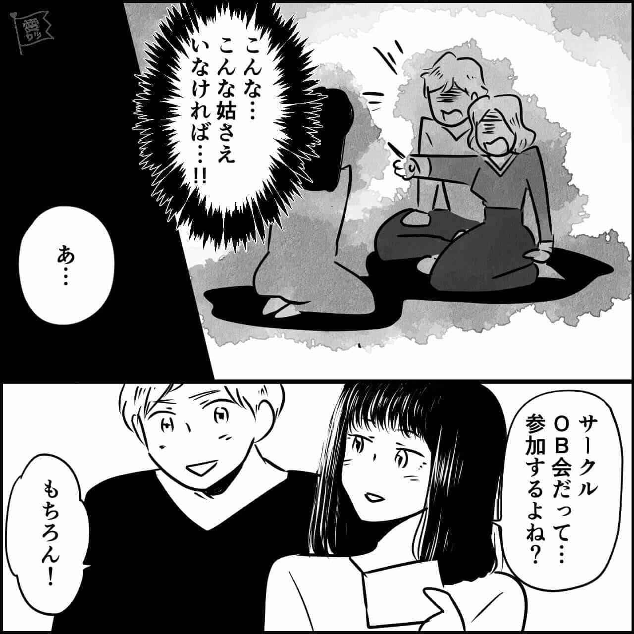 同窓会当日、友人と主人公が思い出話をしていると、夫が嫉妬を抱き始めました…。