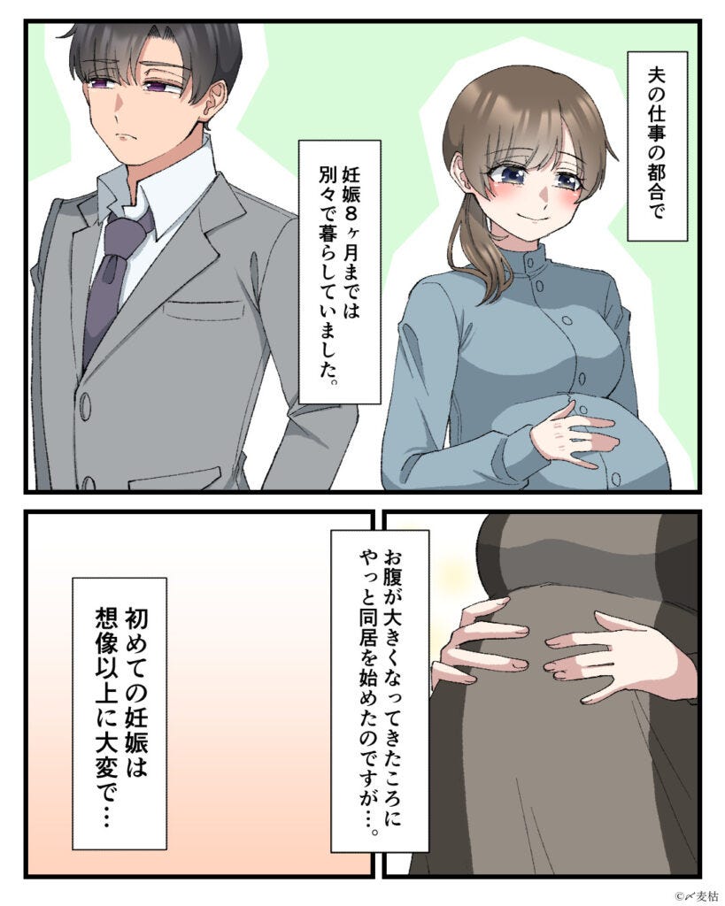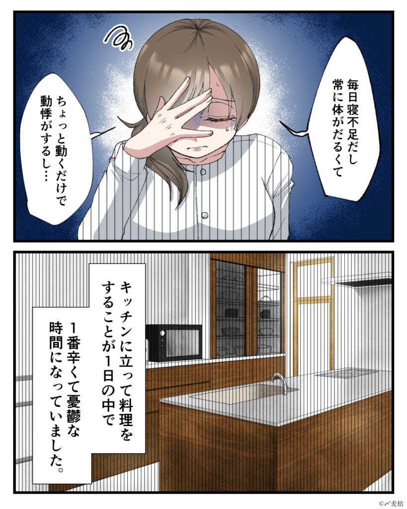 妊娠していてつらいなか、がんばって料理をしていた主人公。