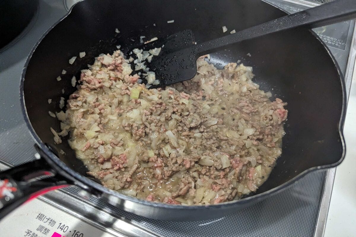 まずはバターで玉ねぎとひき肉を炒め、塩コショウとスパイスを加えるのだが、同時にレンジでじゃがいもを加熱すると時短になる。時間はじゃがいもはボウルに入れて水を少し加え600Wで8分程度、ひき肉と玉ねぎはひき肉の色が全体的に変わり、玉ねぎが透き通る程度が良い。