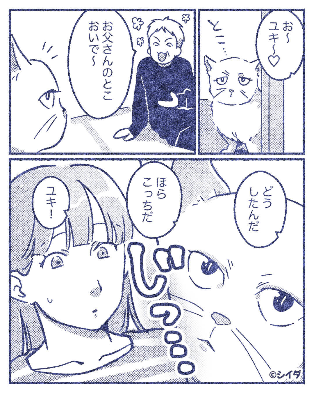 義父は「おいで」と猫を呼びますが、猫は義父を無視して主人公をじっと見つめています。