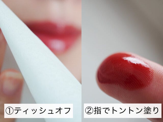 ティッシュオフをしたあとに、指にとったリップをトントンと重ねてみてください。中央から軽く広げる程度に塗ると、リップ本来の色ツヤもほどよく感じられる仕上がりになります。