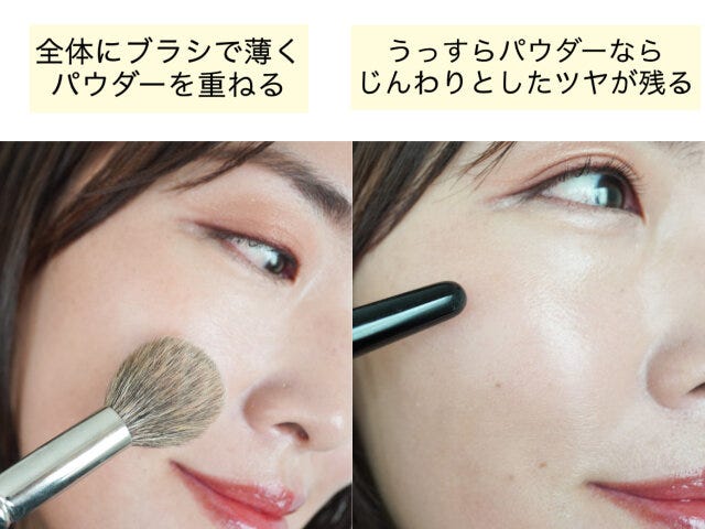 若見えで大事なのは、過剰なツヤではなく清潔感です。全体にパウダーを薄く重ね、ほどよいツヤ加減に調整しましょう。パフでパウダーを塗るとマットになりやすいですが、ブラシで少しずつ重ねていくと、じんわりとした適度なツヤを残せます。