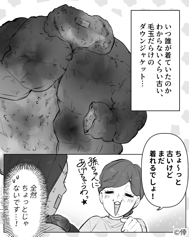 さらに義母は、いつのものかわからないくらい古い毛玉だらけのダウンジャケットを持ってきました。
