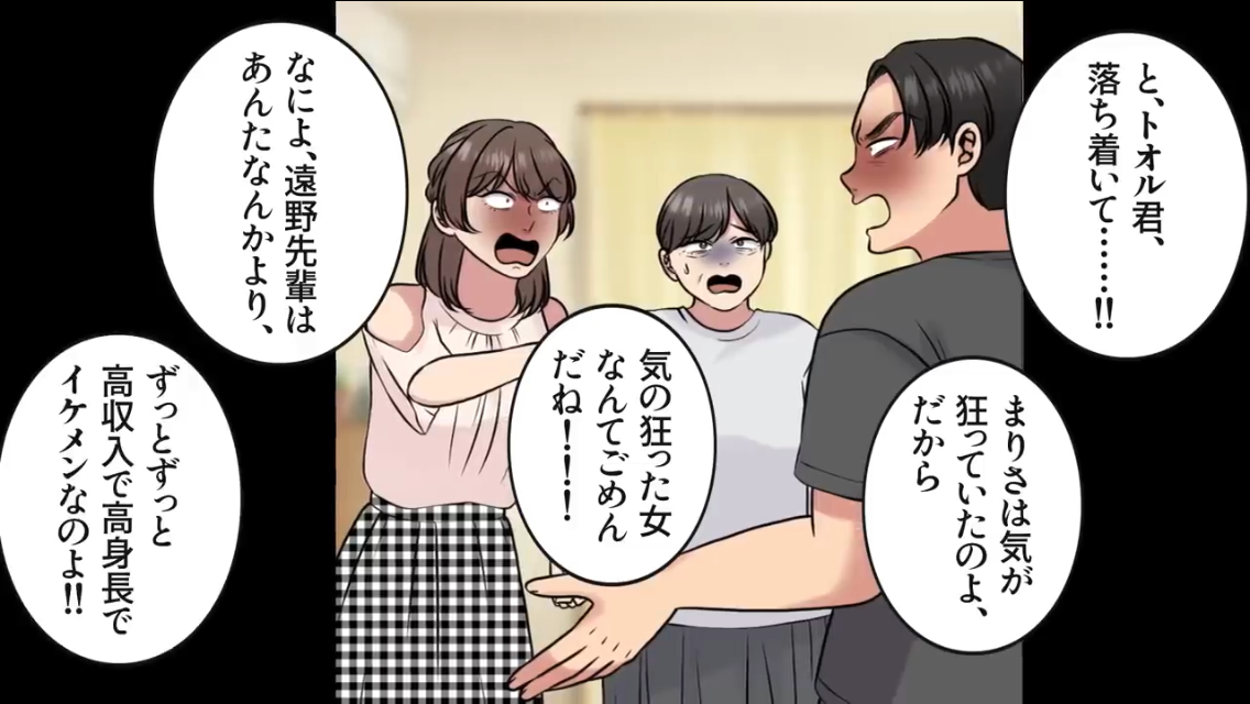 母が庇いますが、彼女は反省しておらず、夫と先輩を比較し始めます。