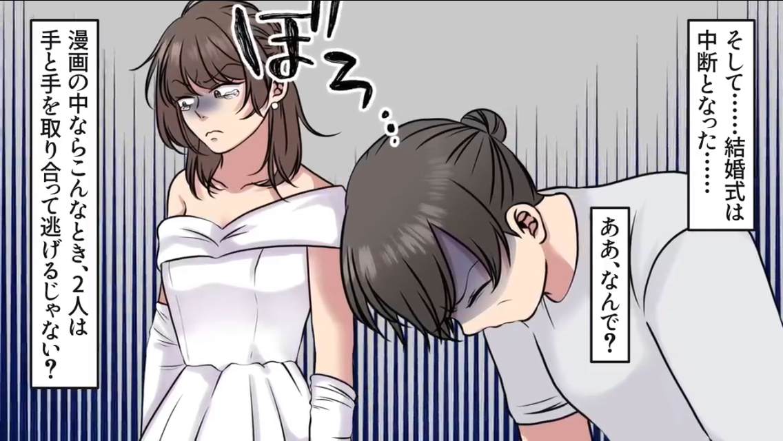 そんな中、突然式場の扉が開き、ウエディングドレスを身にまとった女性が走って中に入ってきました。