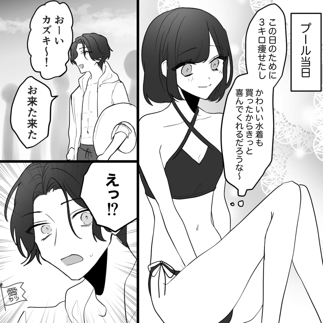 - 【漫画】プールのために3kg減量!しかし当日…彼氏「細くなりすぎて引く~」→この直後【プールならではの撃退方法】にスカッと!