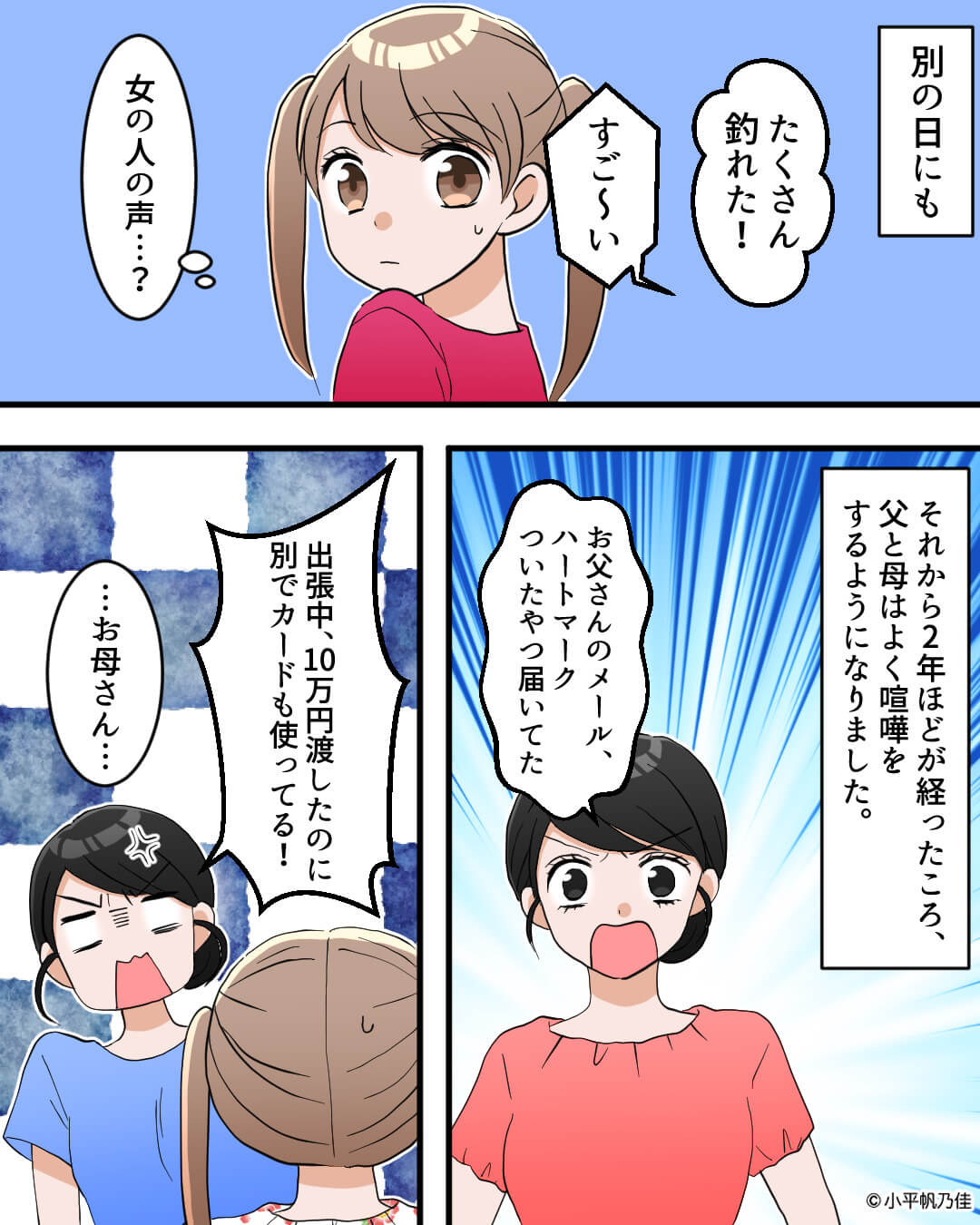 主人公が正直に話したことで父の浮気が発覚…。