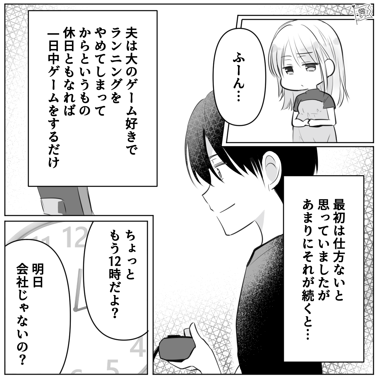 夫は趣味であるランニングをしなくなり、ゲーム三昧の生活へと一転。