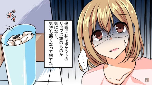 誰の物かわからないリップに気持ち悪さを感じた主人公は、すぐに捨てることに。