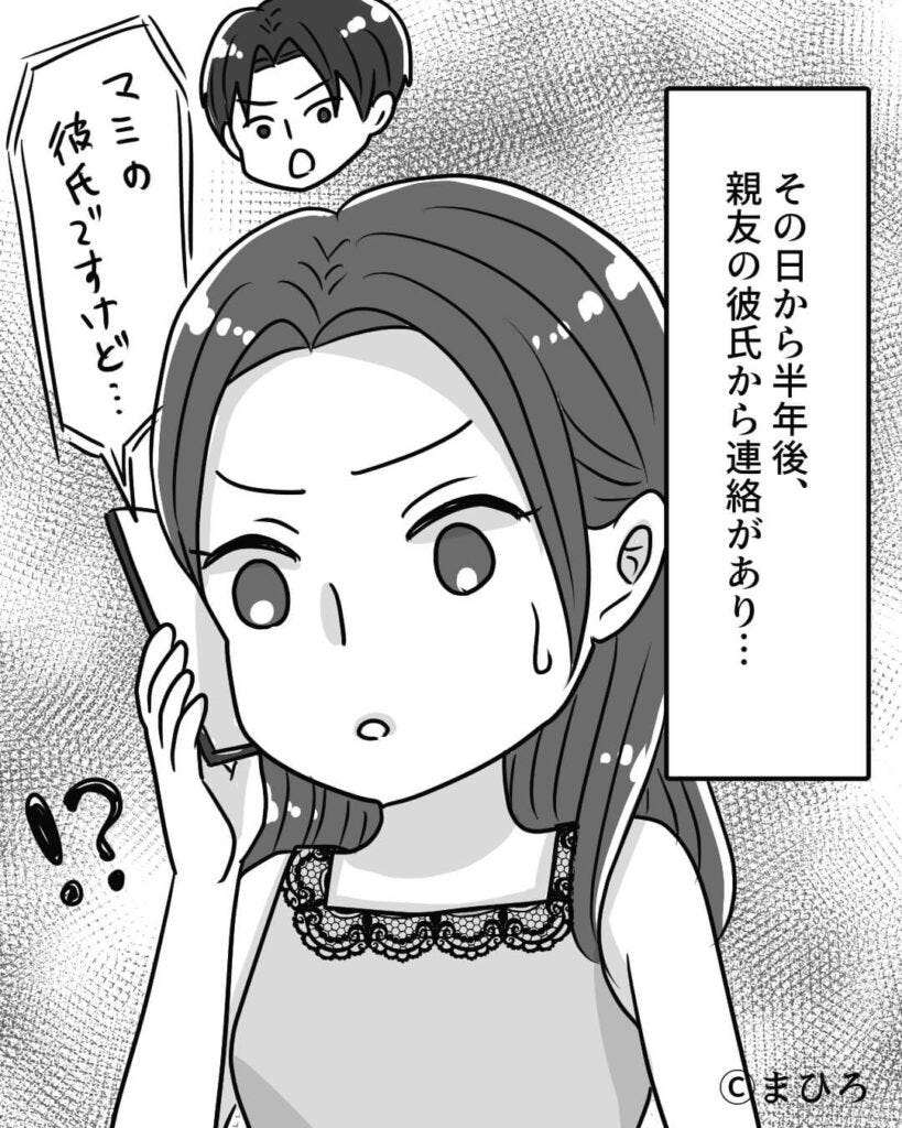 なんと主人公の携帯に親友の彼氏から電話がきて、彼氏と親友が浮気をしていることが発覚。