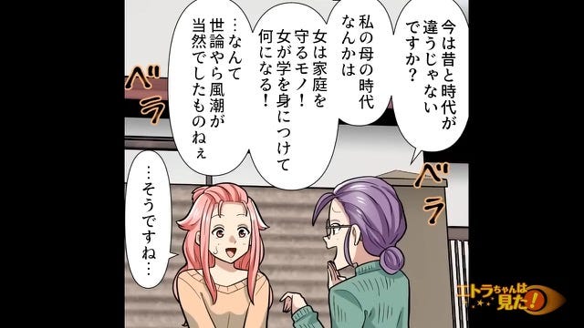 有名な大学を出ているのが自慢の彼女はよく母親に絡んでいました。