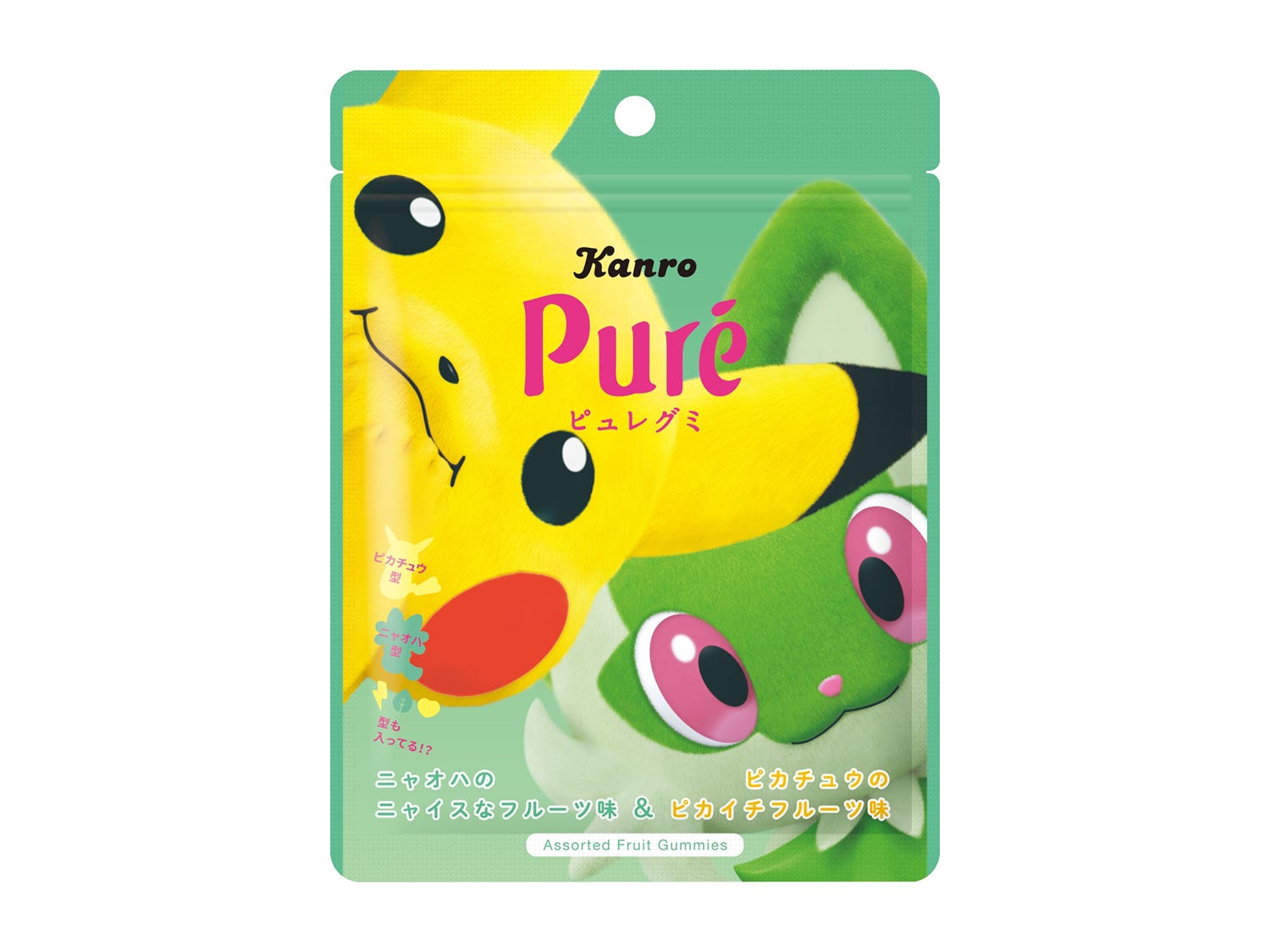 グミ粒は可愛いピカチュウ型とニャオハ型。さらに、見つけたらラッキーなシークレット型は、ピカチュウのでんきタイプ、ニャオハのくさタイプにちなんだ「いなずま型」と「はっぱ型」に加え、「ピュレハート型」も。