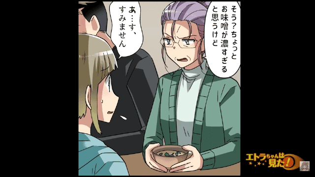 「味噌汁が濃すぎるわ」と、義母は主人公の味噌汁に文句を言います。
