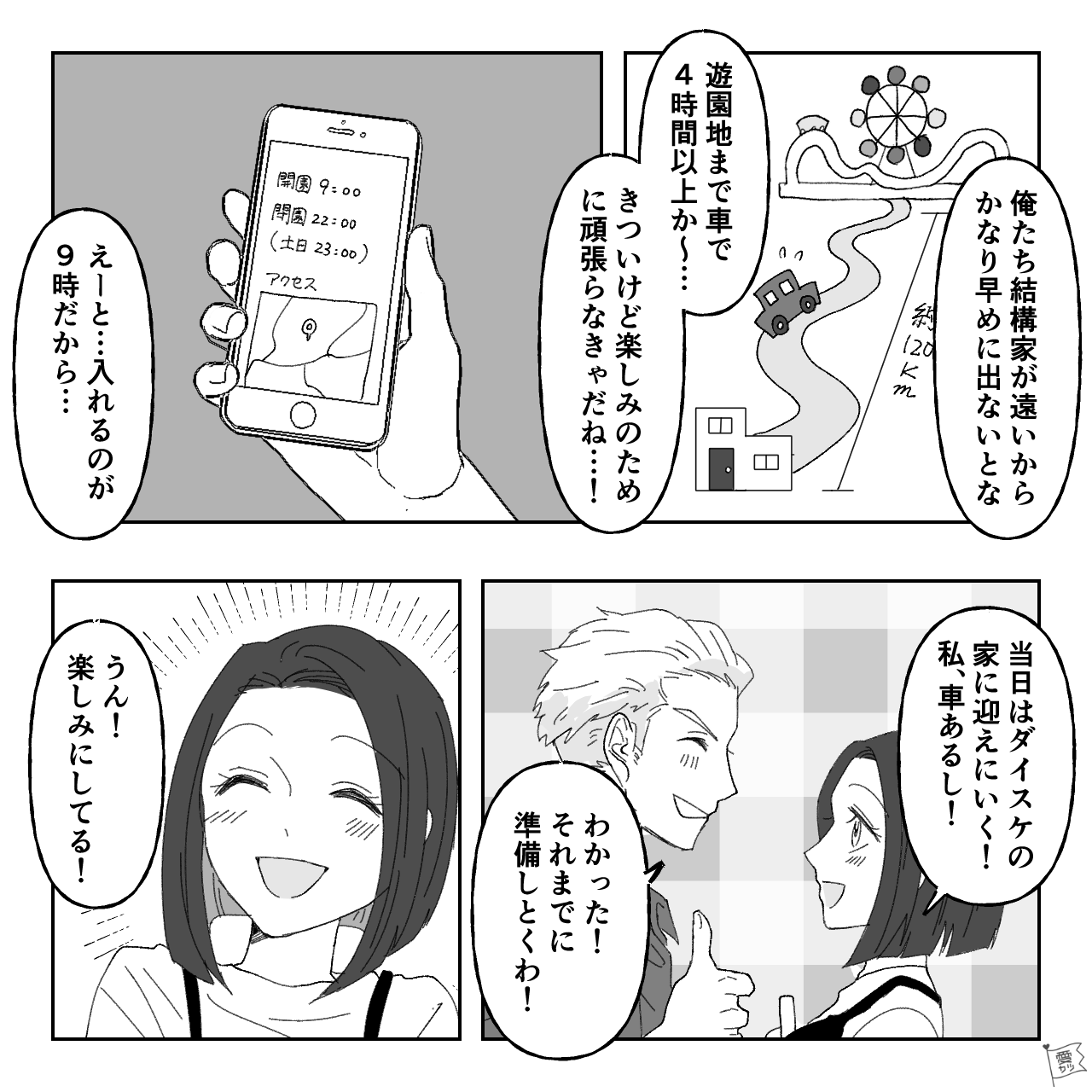 付き合って1年の記念に、遊園地へ行くことが決まったようです。