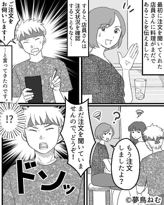 注文を取ってくれた店員に料理がまだ運ばれてこないことを伝えると…。