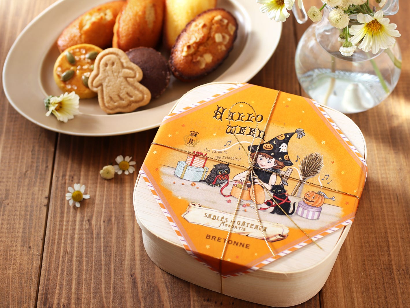 そんな「ビスキュイテリエ ブルトンヌ」の2023年版ハロウィン限定商品も、もちろんキュートなパッケージで登場。アソートボックスには、魔女の女の子と黒猫、ふくろうたちが仲よくお菓子やお花をラッピングしている、ほのぼのとしたシーンが描かれています。また、定番商品のクッキー缶や「プティ・フィナンシェ アソルティ」などにも、ちょこんと首をかしげるかわいい黒猫のハロウィンカードが付いています。