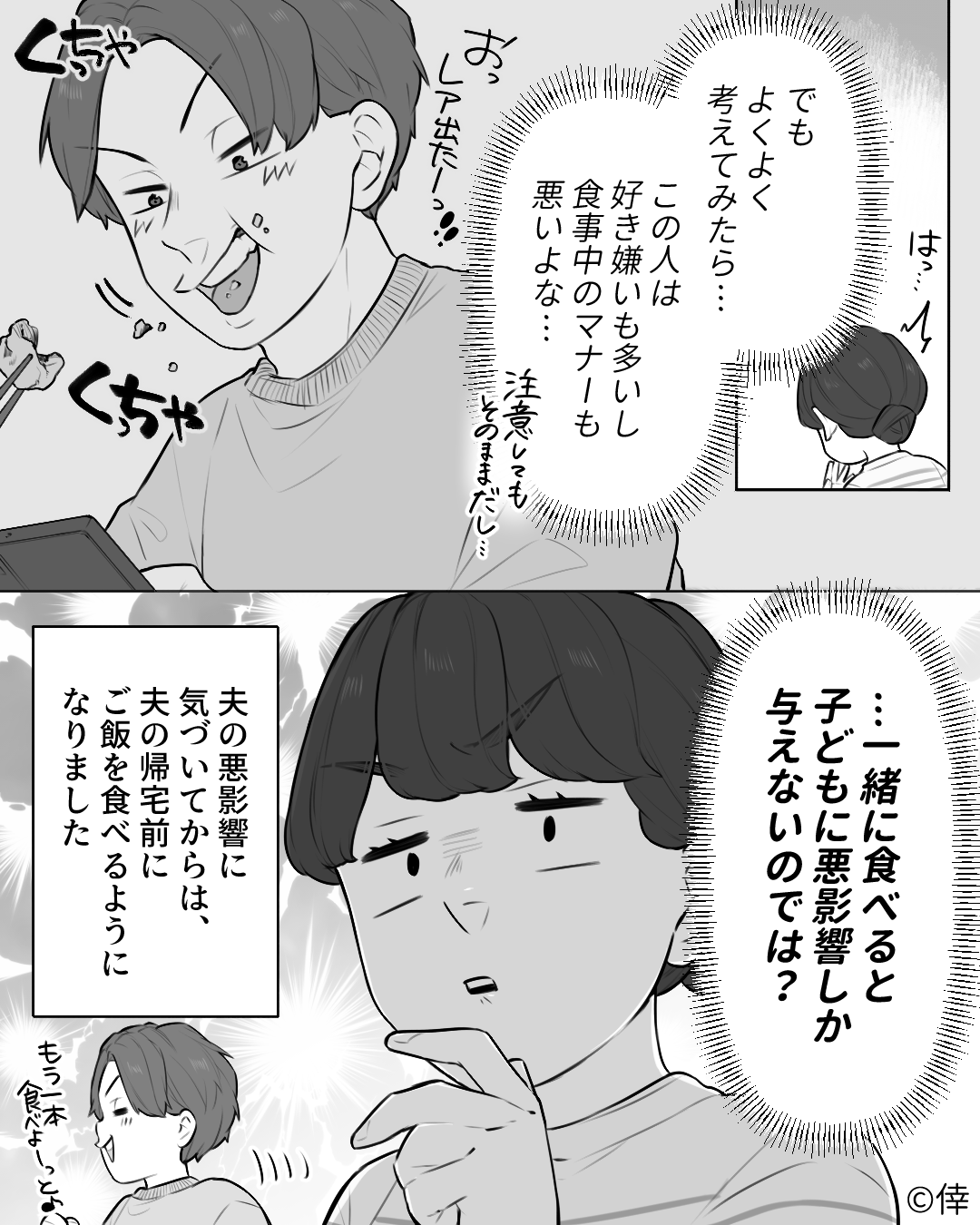 「よくよく考えると、息子に悪い影響しか与えないのでは…?」と思い、いつの間にか夫の帰宅前に食事するようになりました。(エピソード提供者)