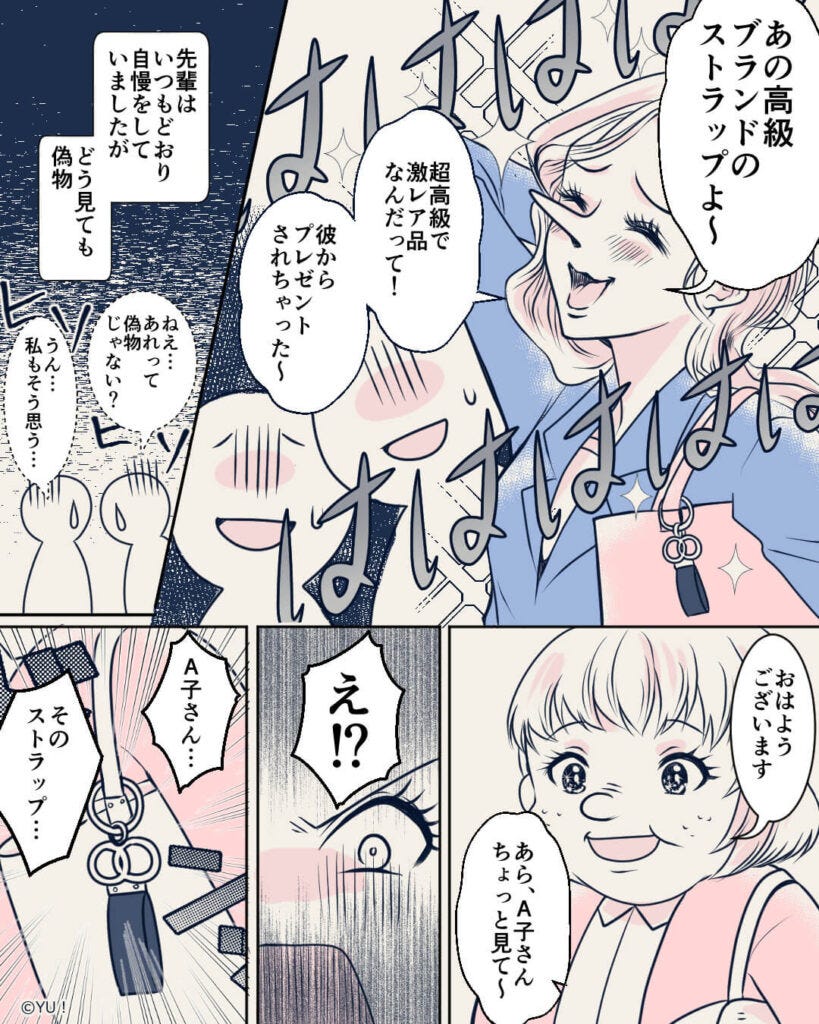 その直後に出勤してきた女性のバッグには、先輩と同じ高級ブランドのストラップが…。