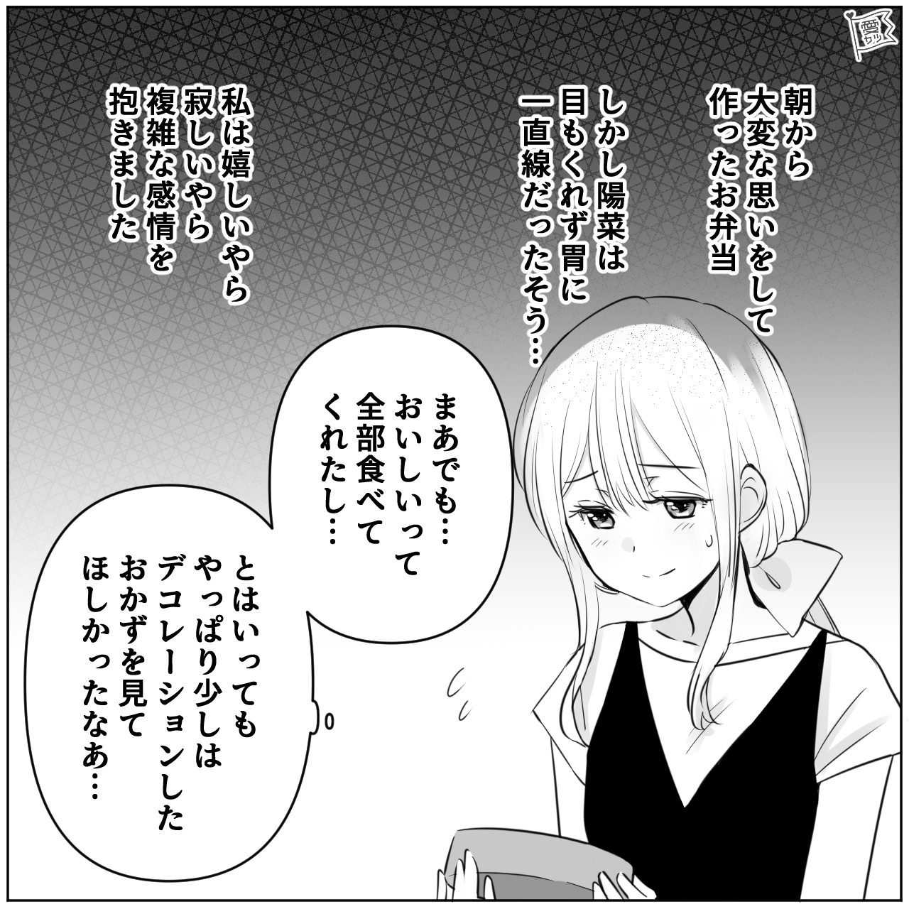 複雑な感情を抱く主人公ですが、娘は残さずお弁当を食べてくれたようですね。