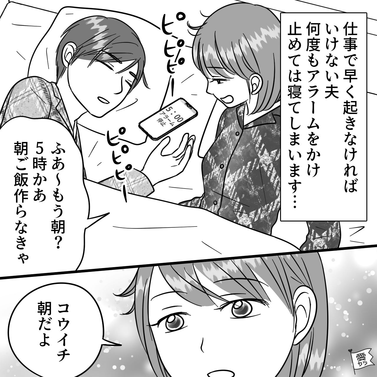 仕事で早く起きなければいけない夫は、何度もアラームをかけ、止めては寝てしまいます。