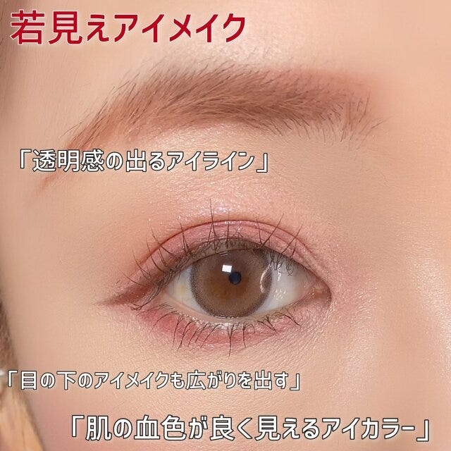 若見えアイメイクは、肌の血色が良く見えるアイカラーを使ってアイラインは目元がスッキリ見えて透明感の出るカラーで目尻中心に入れます。