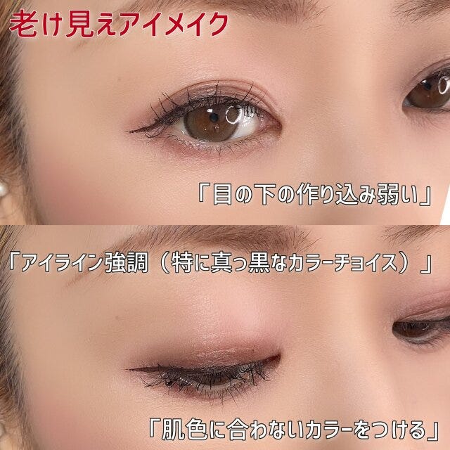 老け見えアイメイクの3大ポイントは「肌色に合わないカラーをつける」「アイライン強調(特に真っ黒なカラーチョイス)」「目の下の作り込みが弱い」です。