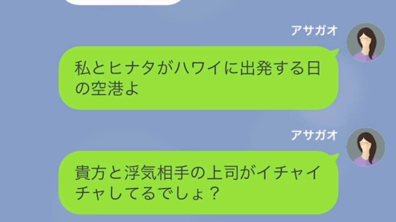 主人公はハワイに出発する日、空港で夫と浮気相手を目撃していました。