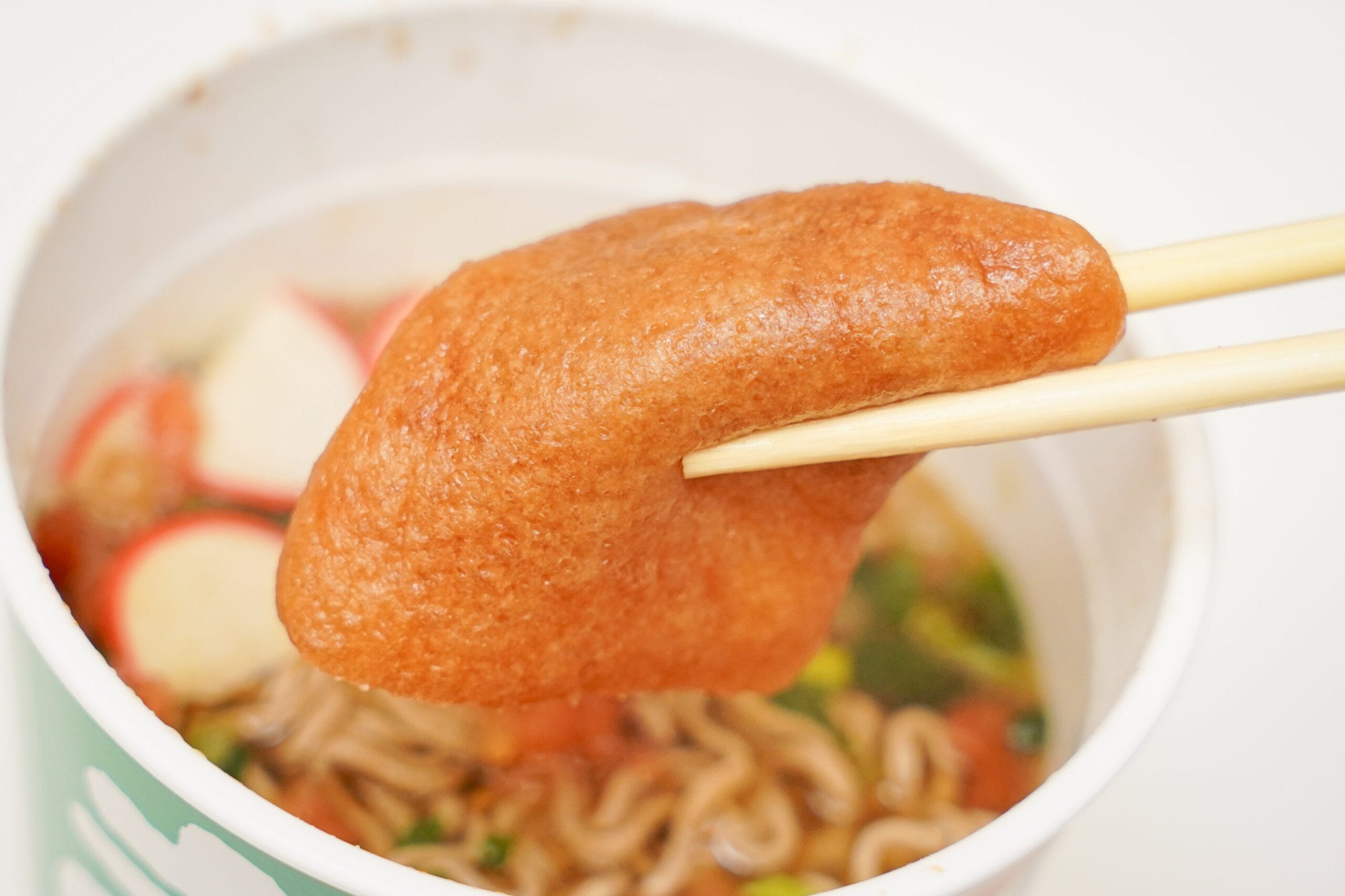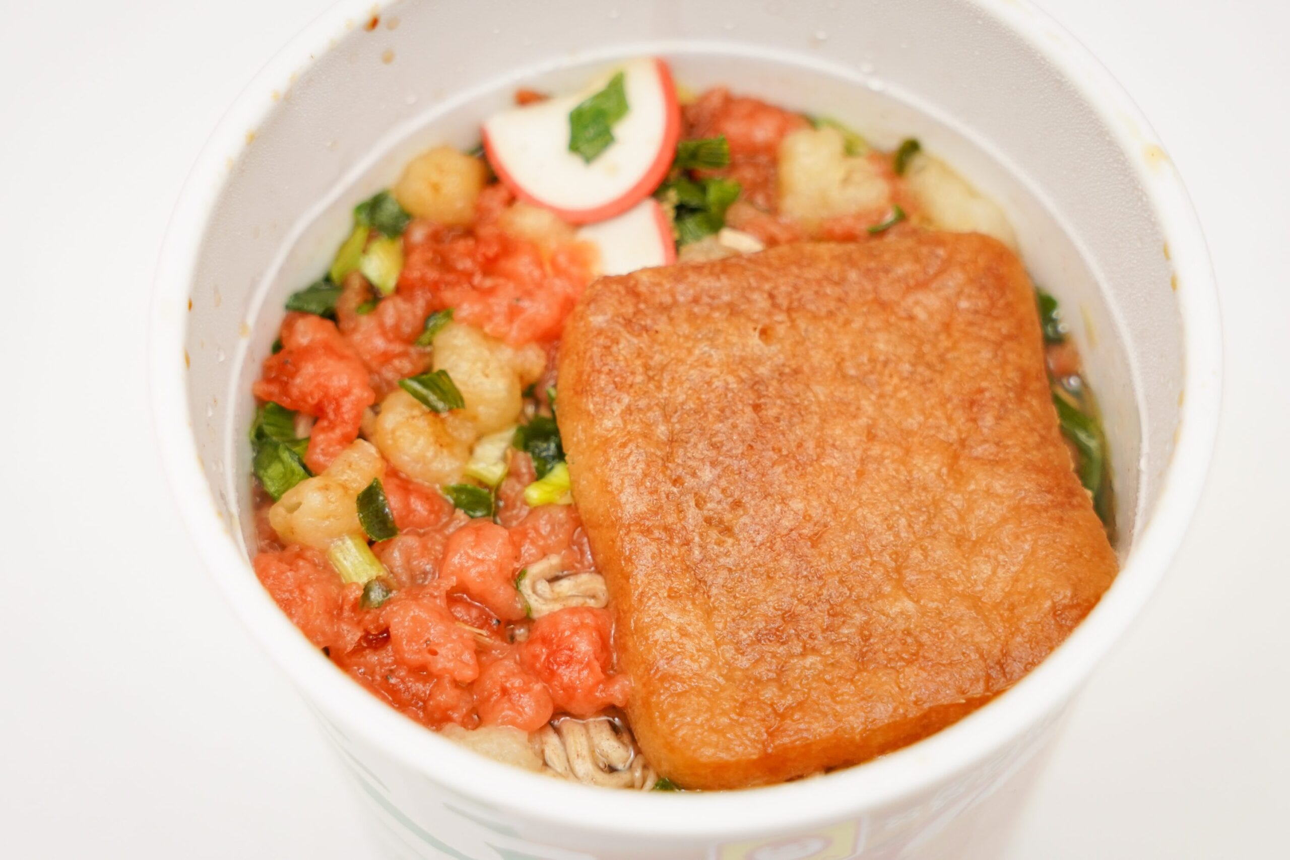なお、この商品の最たる特徴は「トッピングのお揚げと小エビの天ぷらがどちらも味わえる」というところ。赤いたぬきには天ぷらとカットされたお揚げが、緑のきつねにはお揚げと細かい天ぷらが入っているのだ。