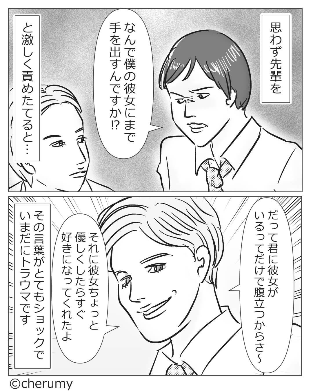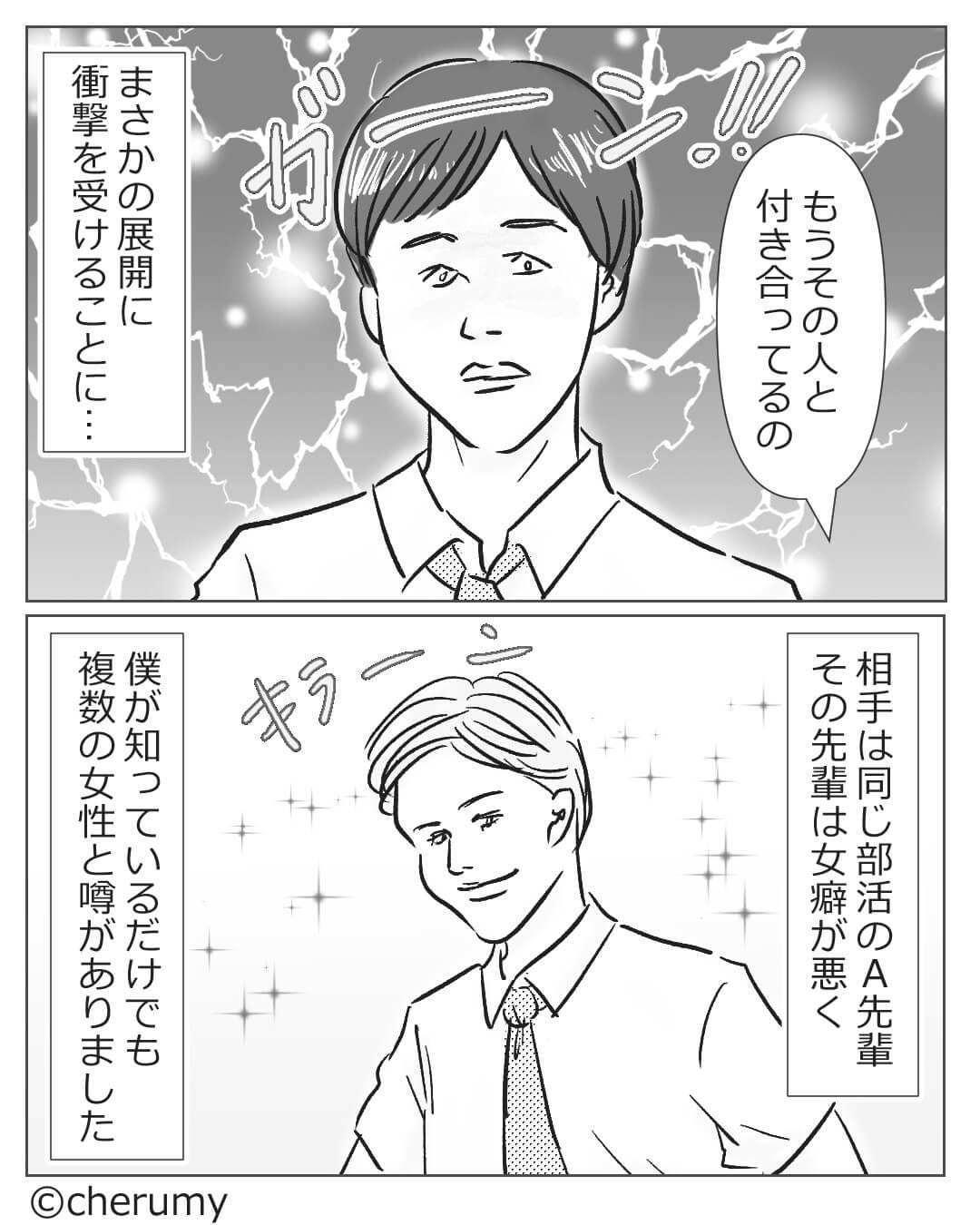 先輩の衝撃的な言葉にショックを受けた主人公。