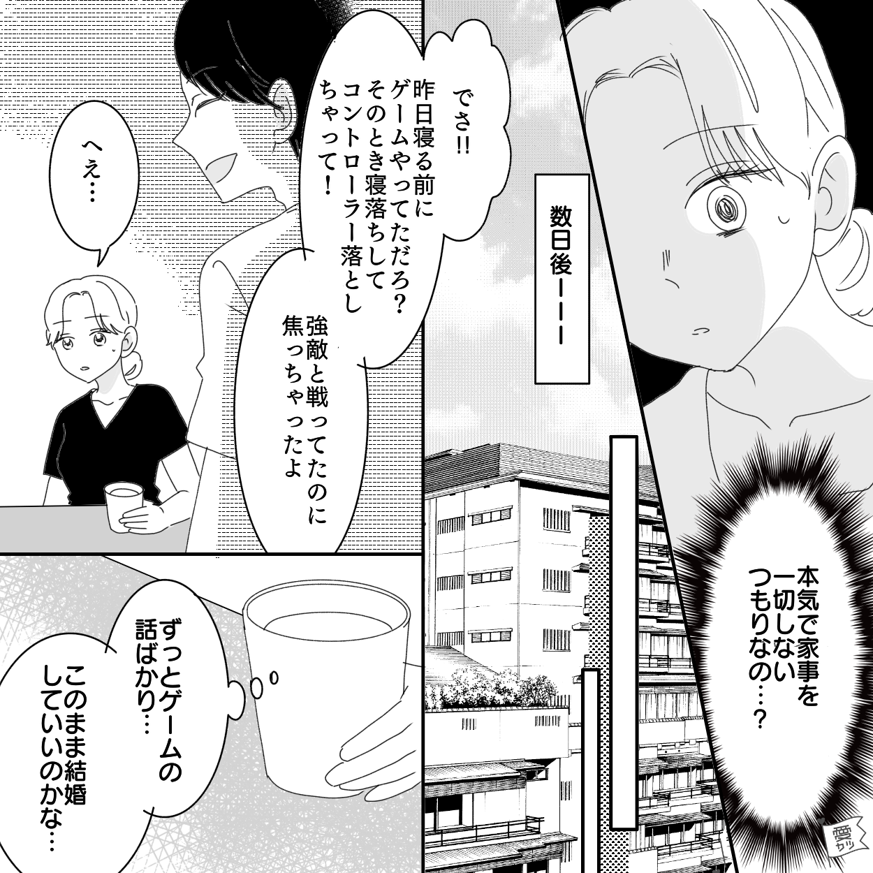 その数日後、ゲームの話ばかりしてくる彼氏を見て、将来に不安を感じる主人公。