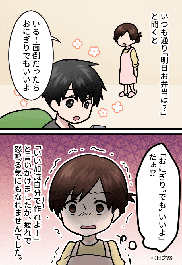 - ▶『おにぎりでもいいよ』夫の言葉に怒りMAX⇒その後、妻が取った行動とは…